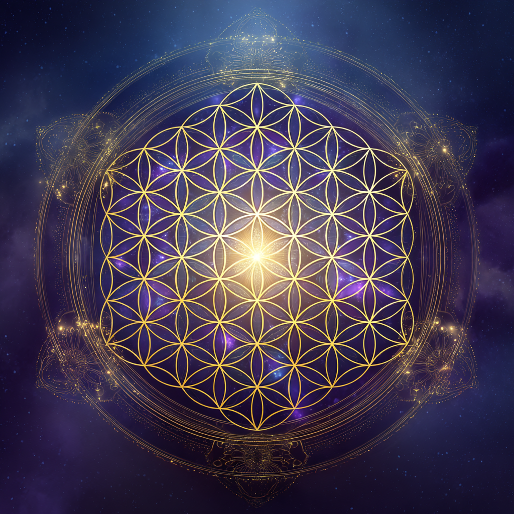 La Flor de la Vida es un patrón geométrico formado por 19 círculos entrelazados que crean una estructura perfecta de 6 pétalos repetidos.
